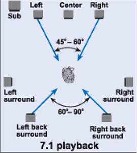 В звуковых решениях стандарта 5.1 используется четыре основных, центральный и низкочастотный каналы. При 7.1, в набор включают дополнительные динамики, обеспечивающие стереофонический задний канал. Чтобы это было проще понять, вглядитесь в конфигурацию, представленную на иллюстрациию.