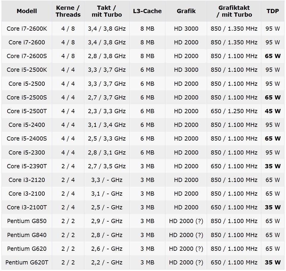 Как мы знаем, крупнейшие производители системных плат уже успели продемонстрировать целые семейства LGA1155-совместимых потребительских продуктов на основе настольных чипсетов P67 Express и H67 Express, в то время как о грядущем ассортименте процессоров до сих пор информации было не слишком много. Нашим коллегам из немецкого веб-ресурса Computerbase удалось получить доступ к техническим характеристикам процессоров Sandy Bridge «первой волны», которые для удобства чтения сведены в единую таблицу: