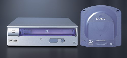 Емкость 23,3 ГБ, синего цвета, использует диск, заключенный в картридж, именуется «заменой DVD-RAM». Это не Blu-Ray, и это не HD-DVD. Это – стандарт Professional Disc for DATA (PDfD), одна из попыток Sony застолбить свою часть рынка оптических носителей будущего поколения, и привод Buffalo соответствующего стандарта, второго после привода самой Sony, выпущенного несколько месяцев назад.