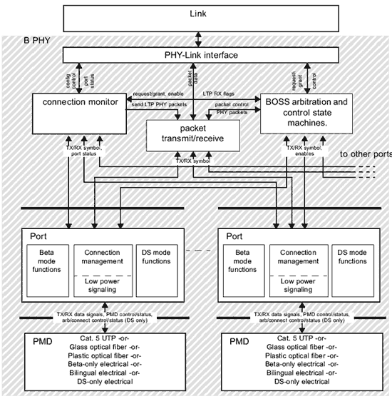 Главное, что обещают в 1394b, это появление новых скоростей, в 800 и 1600 мегабит в секунду (возможно, и 3200 мбит/сек), и увеличение максимальной длины кабеля до 50, 70 и даже до 100 метров. Изменились разъёмы, которые могут использоваться, и кабели. В 1394b могут применяться даже простые UTP кабели 5 категории, но только на скоростях до 100 мбит/сек. Для достижения максимальных скоростей на максимальных расстояниях предусмотрено использование оптики (fiber optics), пластмассовой - для длины до 50 метров, и стеклянной - для длин до 100 метров. Архитектура 1394b устройства выглядит так: