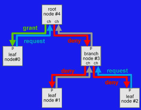 Устройство, которое хочет начать передачу, вначале посылает запрос своему родительскому устройству. Родительское устройство, получив запрос, запрещает передачу всем остальным дочерним (в один момент обрабатывается только один запрос) и, в свою очередь, передаёт запрос дальше, своему родительскому устройству, где всё повторяется. В итоге запрос доходит до корневого устройства, которое, в свою очередь, разрешает передачу тому устройству, чей запрос пришёл первым. Всем остальным передача запрещается. Таким образом, если два устройства одновременно пошлют запрос на передачу данных, то ответ будет зависеть от того, чей запрос первым достигнет корневого устройства. Оно выигрывает арбитраж и получает право начать передачу. Проигравшее устройство. не получив разрешения на передачу, вынуждено ждать, пока выигравшее не освободит шину.