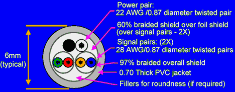 Для работы на таких высоких скоростях потребовались соответствующие кабели. Кабель для IEEE 1394 весьма сложная система, и спаять его самостоятельно (что возможно для USB) вряд ли возможно. Данные передаются по двум витым парам, каждая из которых отдельно экранирована. Для пущей надёжности, дополнительно экранируется и весь кабель. Кроме двух сигнальных пар, в кабеле предусмотрены две питающие жилы, которые могут обеспечить любое внешнее устройство током силой до 1.5 А и напряжением до 40 V. В разрезе кабель выглядит так: