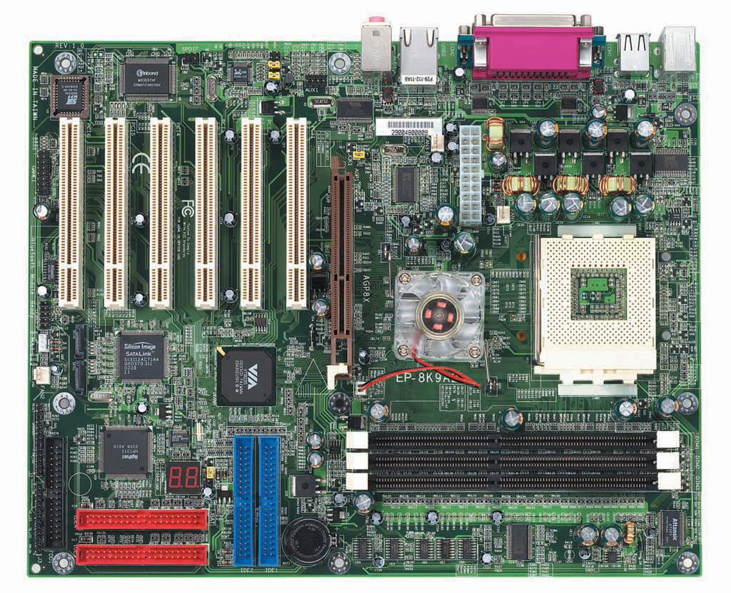 Поддержка процессоров Socket A for AMD Athlon™, Duron™, Athlon™ XP CPU с частотой системной шины 266/333Мгерц (заметьте - в данном случае частота 333 - официальная); VIA KT400 Chipset (KT400 + VT8235); 6 слотов PCI и один AGP с поддержкой 8X; 3 слота DIMM (поддержка PC3200 - неофициальная); встроенный 6канальный звук; 4 встроенных USB 2.0 порта + брекет с 2 внешними. "Расширенный" вариант платы имеет на борту RAID контроллер HPT372 производства High-Point, сетевой контроллер и микросхему SAtaLink производства SiliconImage для поддержки SerialATA (на материнской плате 2 соответствующих коннектора). Кроме того, в расширенном варианте платы будут круглые шлейфы (что становится уже стандартом для продвинутого и избалованного компьютерным моддингом западного покупателя) и Magic-Light™ Chipset FAN. Насчет последнего ничего точно не известно, но, скорее всего, это обычный вентилятор, сделанный из прозрачной пластмассы, с установленными светодиодами