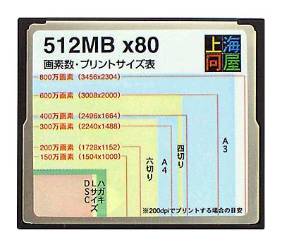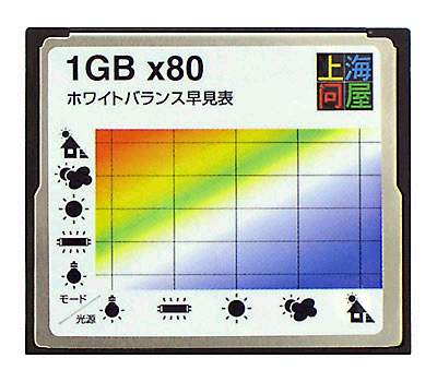 На корпусе карты емкостью 2Гб нанесена вспомогательная таблица для определения экспозиции (Suitable Exposure graph), 1-гигабайтная карта «оформлена» таблицей для проверки баланса белого (White Balance Quick Reference), а 512-мегабайтная модель - графиком Pixel Count/Print Size, позволяющим сопоставить разрешение камеры с разрешением снимков, которое необходимо выставить, для печати фотографий в 200dpi.
